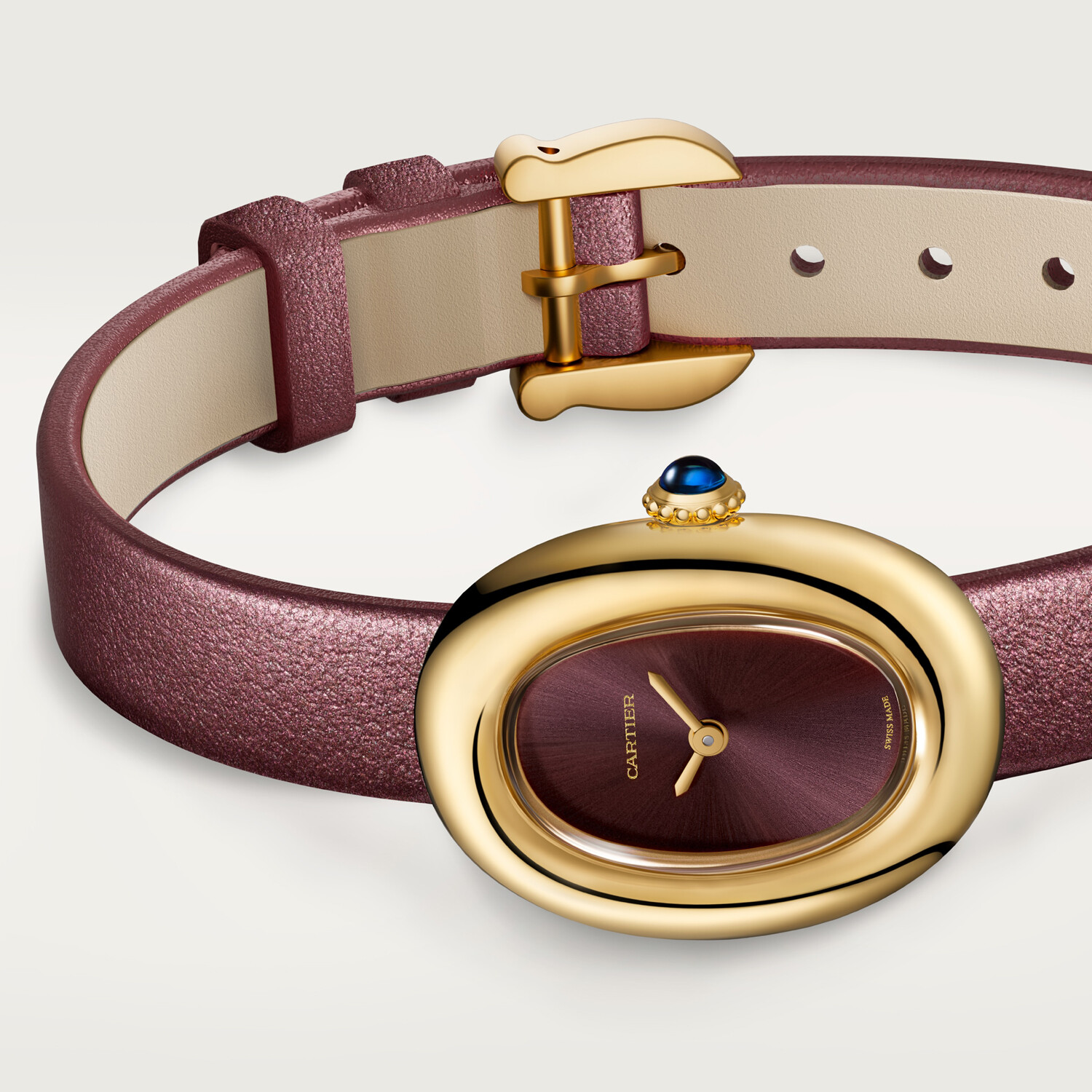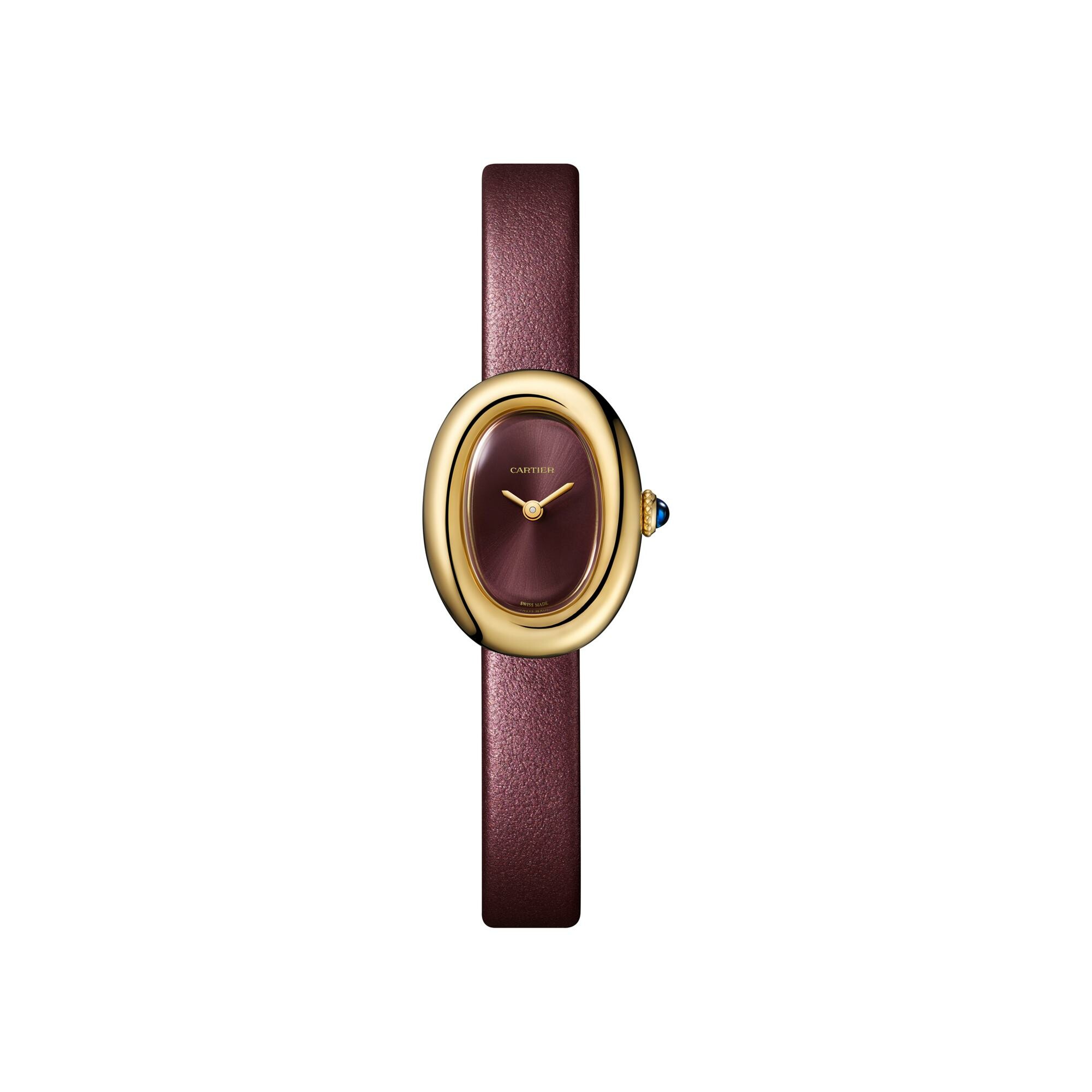 Montre Baignoire de Cartier, mini modèle, mouvement à quartz. Boîte en or jaune 750/1000. Couronne perlée en or jaune 750/1000 ornée d'un cabochon de saphir. Cadran laqué couleur prune, aiguilles en forme de glaive en acier finition dorée, glace saphir. Bracelet en veau satiné prune, boucle ardillon en or jaune 750/1000. Longueur: 24,6 mm, largeur: 18,7 mm, épaisseur: 7,2 mm. Etanche jusqu'à 3 bars (~30 mètres)